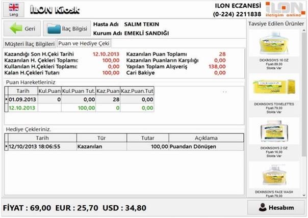 Üzerindeki Kart Okuyucu ile Veya TC Kimlik Numarasından Müşterileriniz Kendi Hesap, Puan, Hediye Çeki Bilgilerine ve İlaç Bitimlerine Ulaşabilirler.